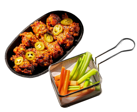 12 закусок по 6 штук каждой: Овощные палочки с соусом блю чиз, жареные креветки с соусом песто